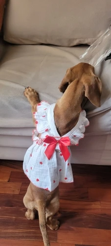 João Gularte Minha cachorrinha é uma dachshund, ela tem 4 meses. Eu pedi no tamanho M. O vestido de algodão é muito fofo. Lindo 🥰🥰